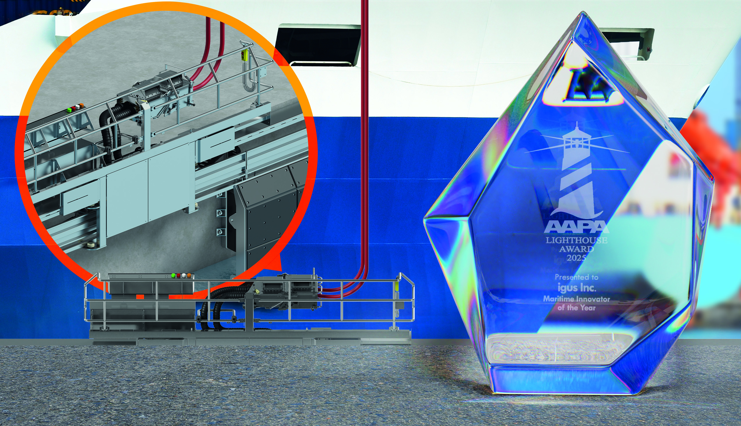 Con su sistema de suministro de energía móvil (iMSPO), igus ha desarrollado un sistema de cold ironing para puertos que puede desplazarse con flexibilidad en función de la posición de los barcos en el muelle. El sistema permite a los buques apagar sus motores diésel en los puertos, cambiar a una fuente de energía en tierra más respetuosa con el medio ambiente y reducir así significativamente sus emisiones de CO2. Por su papel fundamental en la promoción de operaciones portuarias sostenibles y flexibles, igus ha sido galardonado como «Innovador Marítimo del Año». El premio se entregó durante la conferencia de la Asociación Americana de Autoridades Portuarias (AAPA) celebrada en Quebec (Canadá).